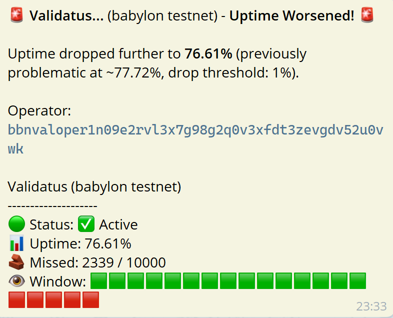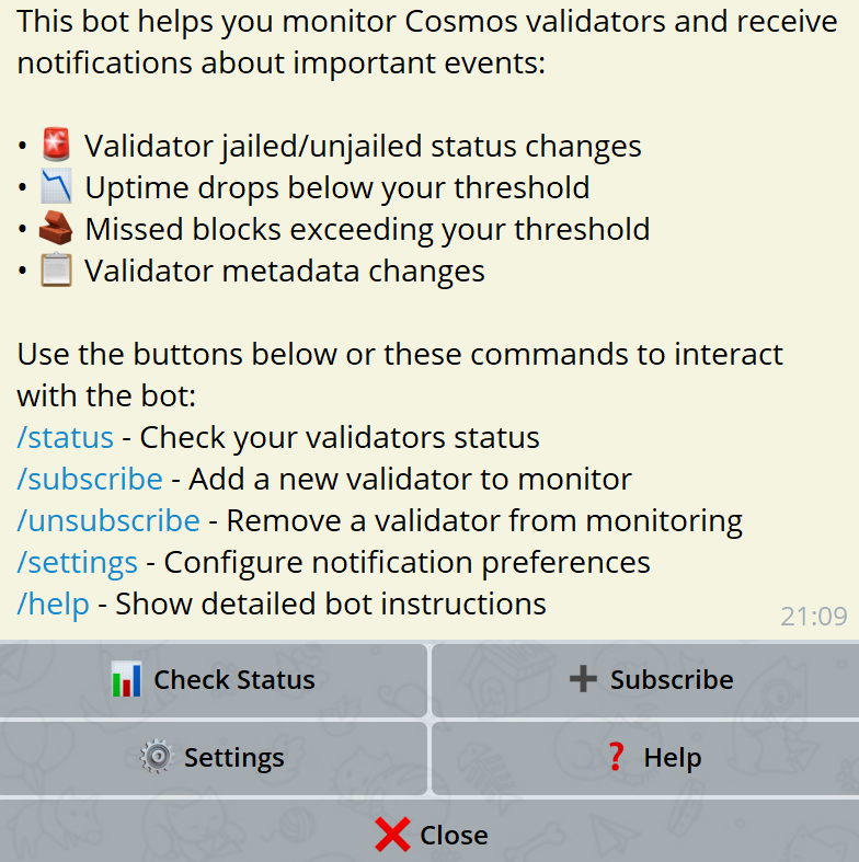 /subscribe— Add validator/unsubscribe— Remove validator/status— Check current status/settings— Configure alerts/help— Full instructions